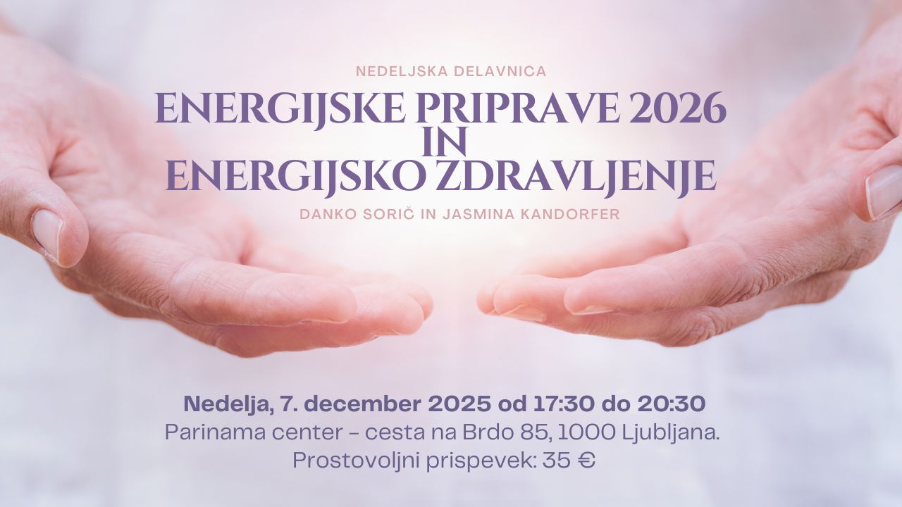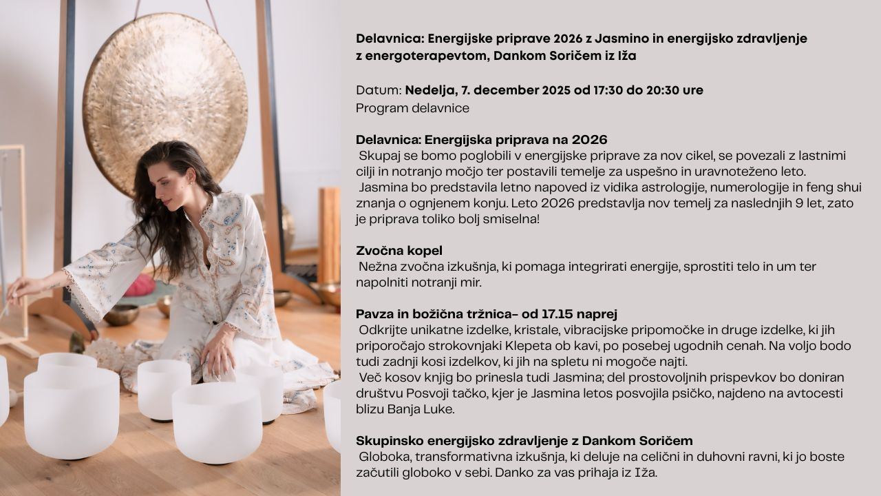 Z Jasmino Kandorfer in energoterapevtom Dankom Soričem bomo ustvarili prostor, kjer se energija sprosti, telo uravnovesi in duša spočije, hkrati pa vas pripravili na naslednji 9-letni cikel, ki ga globalno začenjamo z letom 2026.