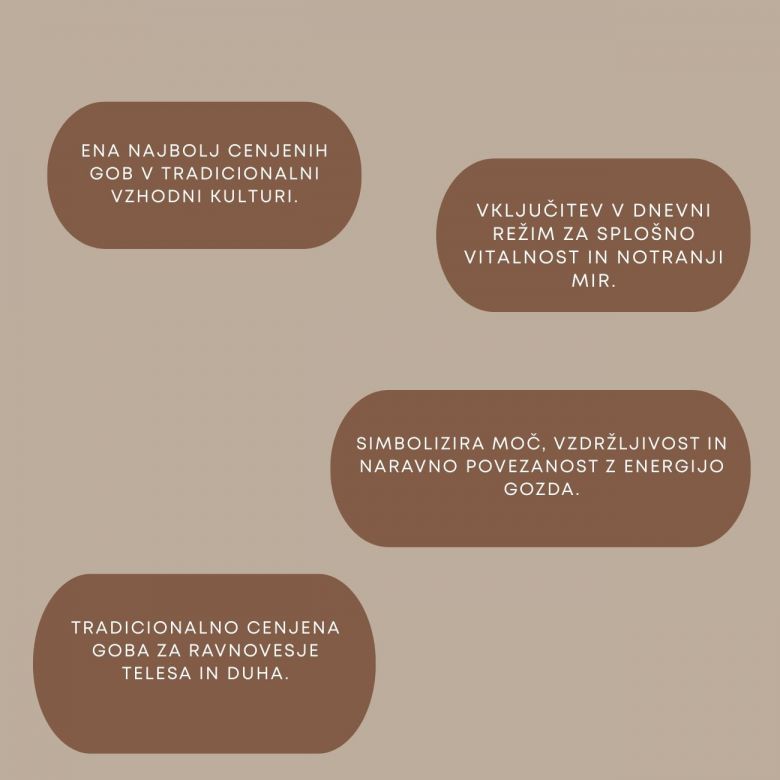 Reishi, znan tudi kot Ganoderma lucidum ali “ling zhi”, ima tisočletno tradicijo uporabe na Daljnem vzhodu. Cenjen je kot simbol dolgega življenja in notranje umirjenosti.