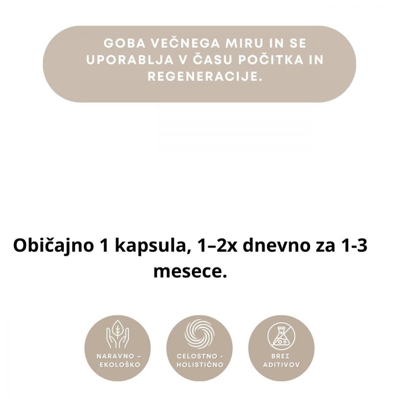 Reishi ali “goba nesmrtnosti” je ena najbolj cenjenih gob v tradicionalni vzhodni kulturi. Uporablja se v fungoterapiji kot del prehranskega režima, ki dopolnjuje telo z rastlinskimi polisaharidi. Ročno nabrane divje gobe so nežno posušene in zmlete, brez dodatkov in polnil.