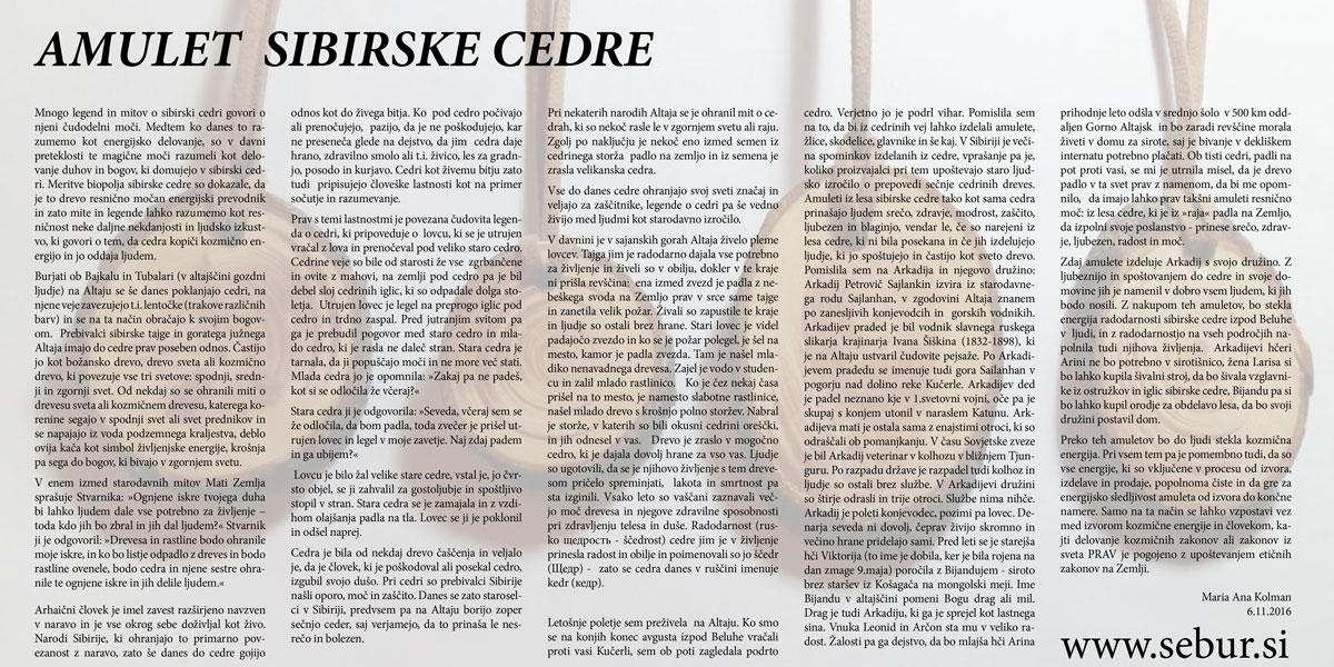 Letošnje poletje sem preživela na Altaju. Ko smo se na konjih konec avgusta izpod Beluhe vračali proti vasi Kučerli, sem ob poti zagledala podrto cedro. Verjetno jo je podrl vihar. Pomislila sem na to, da bi iz cedrinih vej lahko izdelali amulete, žlice, skodelice, glavnike in še kaj. V Sibiriji je večina spominkov izdelanih iz cedre, vprašanje pa je, koliko proizvajalci pri tem upoštevajo staro ljudsko izročilo o prepovedi sečnje cedrinih dreves. Amuleti iz lesa sibirske cedre tako kot sama cedra prinašajo ljudem srečo, zdravje, modrost, zaščito, ljubezen in blaginjo, vendar le, če so narejeni iz lesa cedre, ki ni bila posekana in če jih izdelujejo ljudje, ki jo spoštujejo in častijo kot sveto drevo. Pomislila sem na Arkadija in njegovo družino: Arkadij Petrovič Sajlankin izvira iz starodavnega rodu Sajlanhan, v zgodovini Altaja znanem po zanesljivih konjevodcih in gorskih vodnikih. Arkadijev praded je bil vodnik slavnega ruskega slikarja krajinarja Ivana Šiškina (1832-1898), ki je na Altaju ustvaril čudovite pejsaže. Po Arkadijevem pradedu se imenuje tudi gora Sailanhan v pogorju nad dolino reke Kučerle. Arkadijev ded je padel neznano kje v 1.svetovni vojni, oče pa je skupaj s konjem utonil v naraslem Katunu. Arkadijeva mati je ostala sama z enajstimi otroci, ki so odraščali ob pomanjkanju. V času Sovjetske zveze je bil Arkadij veterinar v kolhozu v bližnjem Tjunguru. Po razpadu države je razpadel tudi kolhoz in ljudje so ostali brez službe. V Arkadijevi družini so štirje odrasli in trije otroci. Službe nima nihče. Arkadij je poleti konjevodec, pozimi pa lovec. Denarja seveda ni dovolj, čeprav živijo skromno in večino hrane pridelajo sami. Pred leti se je starejša hči Viktorija (to ime je dobila, ker je bila rojena na dan zmage 9.maja) poročila z Bijandujem - siroto brez staršev iz Košagača na mongolski meji. Ime Bijandu v altajščini pomeni Bogu drag ali mil. Drag je tudi Arkadiju, ki ga je sprejel kot lastnega sina. Vnuka Leonid in Arčon sta mu v veliko radost. Žalosti pa ga dejstvo, da bo mlajša hči Arina prihodnje leto odšla v srednjo šolo v 500 km oddaljen Gorno Altajsk in bo zaradi revščine morala živeti v domu za sirote, saj je bivanje v dekliškem internatu potrebno plačati. Ob tisti cedri, padli na pot proti vasi, se mi je utrnila misel, da je drevo padlo v ta svet prav z namenom, da bi me opomnilo, da imajo lahko prav takšni amuleti resnično moč: iz lesa cedre, ki je iz »raja« padla na Zemljo, da izpolni svoje poslanstvo - prinese srečo, zdravje, ljubezen, radost in moč.