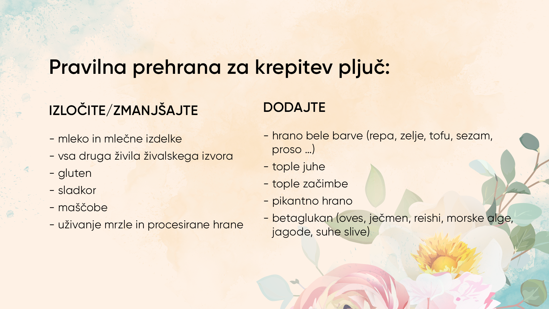NE SABOTIRAJTE LASTNEGA IMUNSKEGA SISTEMA! Ne pomagajte virusom z uživanjem napačne hrane. Če boste jedli hrano, ki zastruplja, zakisa in zasluzi telo (mleko, beli sladkor, bela moka, industrijsko pridelana hrana …), se bo količina sluzi na sluznicah dihal povečala! Večina virusov za svoj razvoj zahteva zakisanost tkiv, zato njihovo napredovanje zaviramo z bazično prehrano (zelenjava, čemaž, začimbe, alg, ječmenova trava, koprive …). Poskrbite torej za vnos zelene zelenjave. Klorofil je namreč tisti, ki je znan po svoji visoki bazičnosti (in posledično skrbi za zmanjšanje kislosti v telesu). E-priročnik Razkisanje telesa in alkalizacija najdete tukaj: https://klepetobkavi.si/