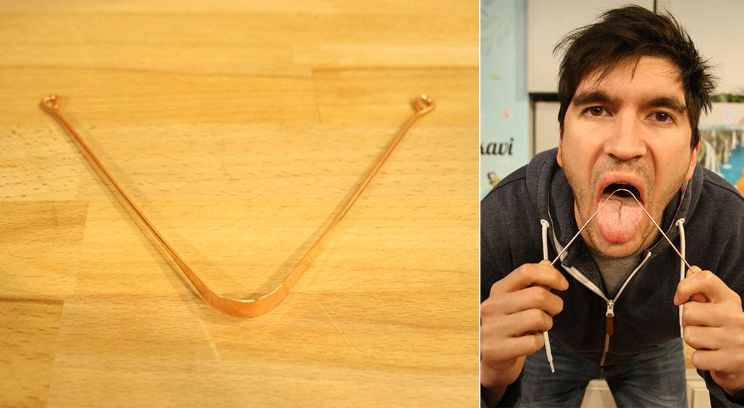Pred umivanjem zob vsako jutro z bakrenim strgalom odstranimo obloge, s tem pa tudi vse bakterije. Poleg tega na tak način zmasiramo točke na jeziku, ki so neposredno povezane z notranjimi organi.