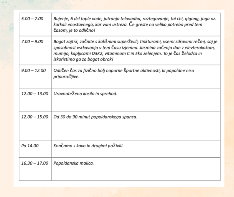 Spodnja shema vam bo pomagala pri planiranju celotnega dne, z zavedanjem, da gre za premišljen dnevni ritem, ki prispeva tako k hormonskem ravnovesju, meridianom in ostalim procesom posameznih organov, ki potekajo čez dan.
