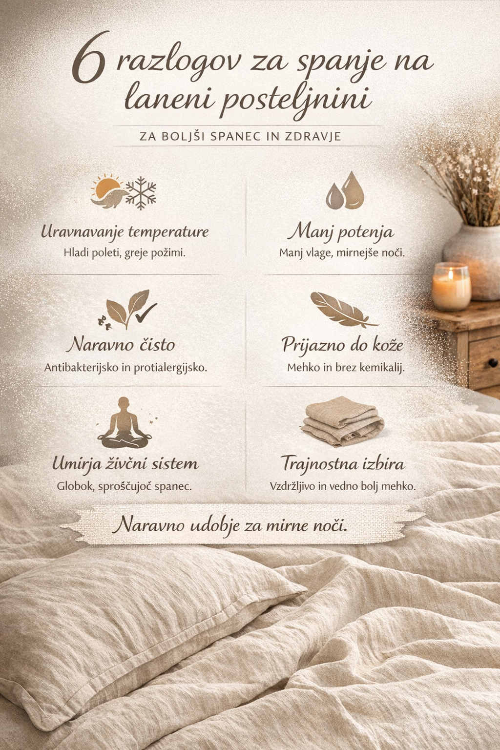 Lan je ena najstarejših in najbolj cenjenih naravnih tkanin. Odlikujejo ga zračnost, trpežnost, antibakterijske lastnosti in izjemen občutek na koži. Prav zaradi teh lastnosti je lanena posteljnina odlična izbira za vse letne čase.