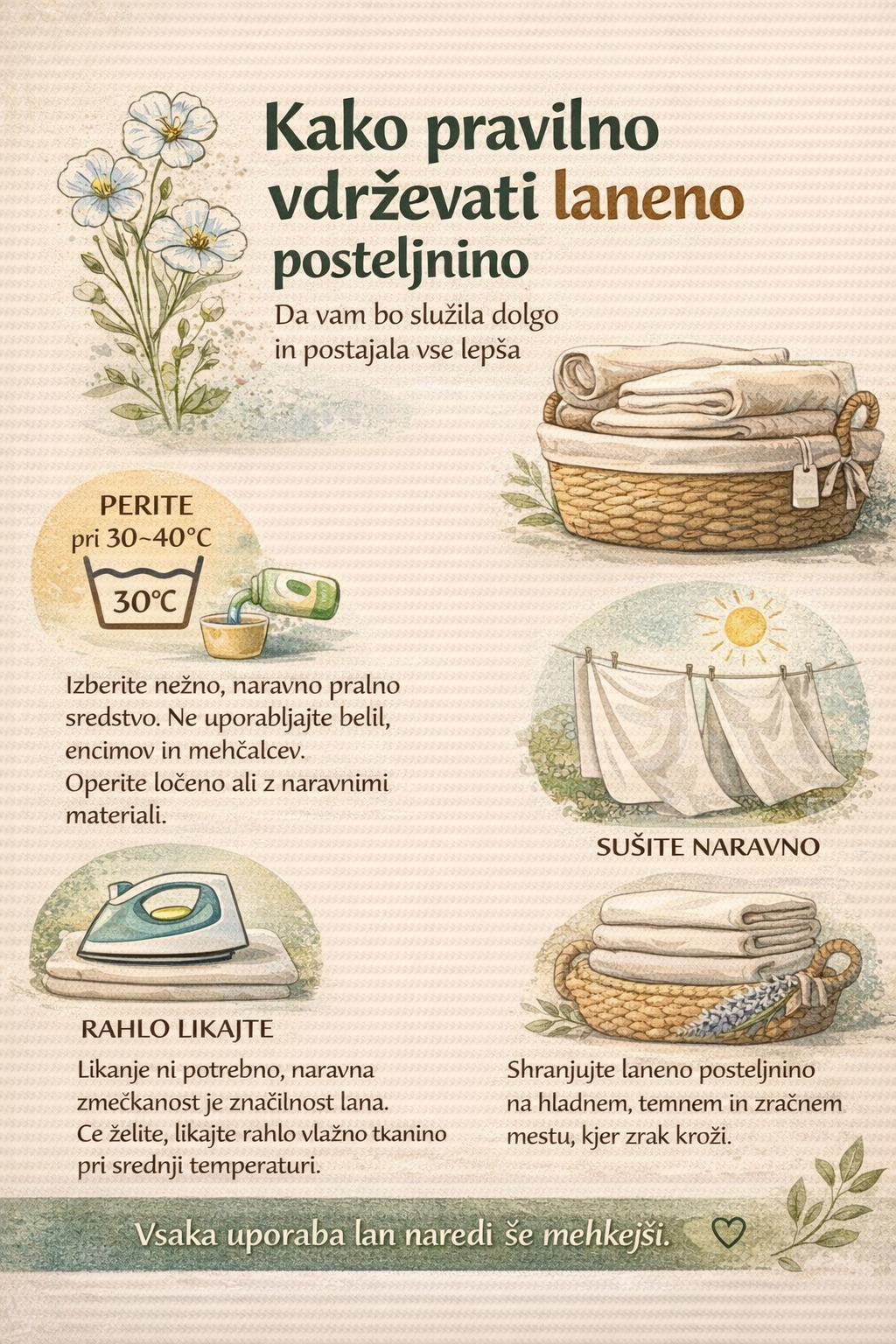 Ob pravilni negi lahko kakovostna lanena posteljnina zdrži več let in ohrani svoj naraven, eleganten videz.
