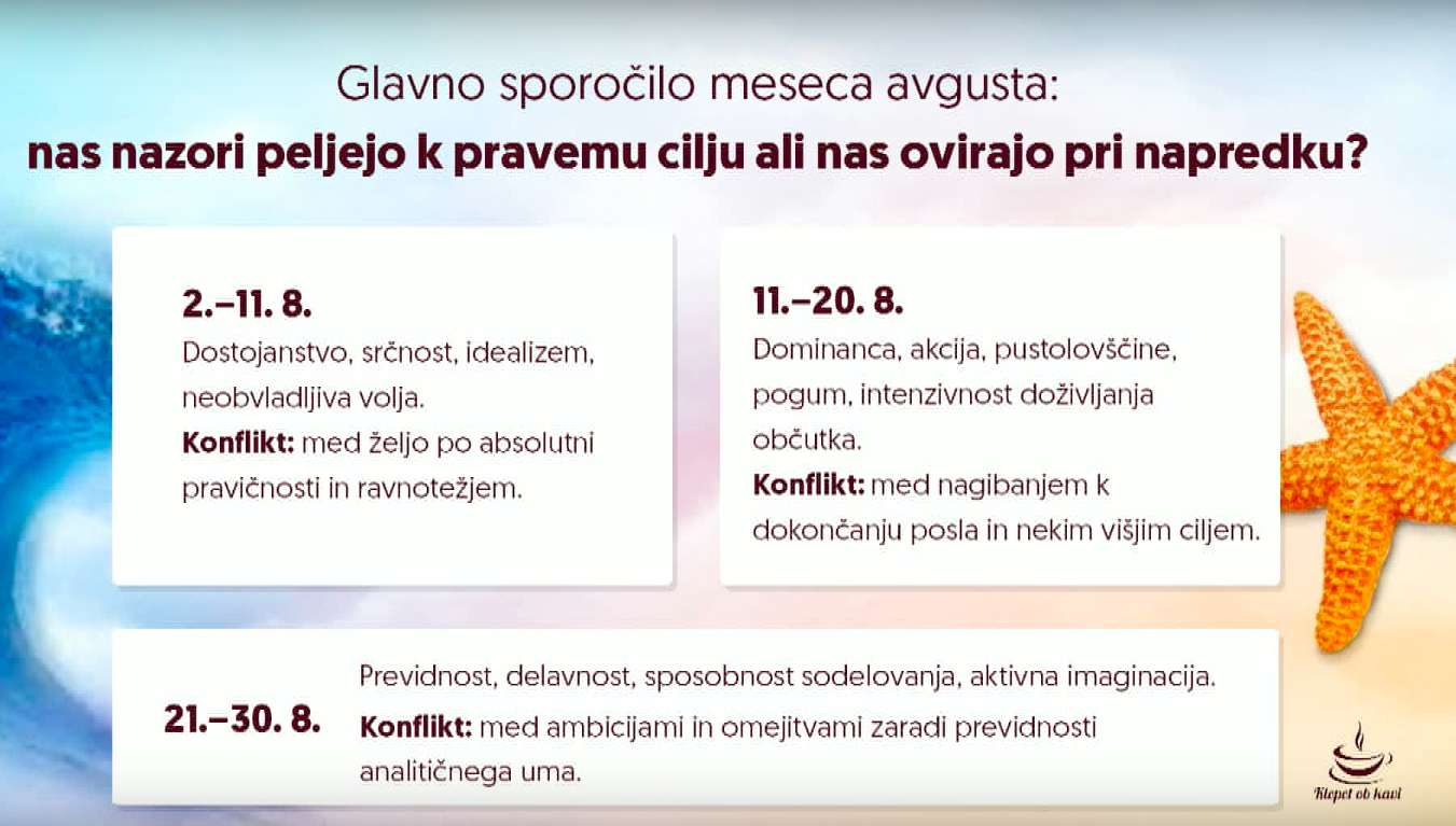 V tokratni oddaji preverite, kakšne energije nas bodo obdajale meseca avgusta. Feng shui, djotiš in karmični nasveti naših dragih gostij vam bodo pomagali, da izboljšate področja, ki jih energije podpirajo, in se pripravite na tista, ki so na udaru. Energije meseca avgusta bodo podpirale ideje, ustvarjalnost in novo znanje, Jupiter in Merkur se bosta postavila v direktno smer, mesec Opice ali mesec žetve oz. motnje v pretoku energij po feng shuiju bo prelomen za 3 znake, v karmičnem smislu pa bodo na preizkušnji dostojanstvo, srčnost, idealizem, neobvladljiva volja. Spraševali se bomo tudi, ali nas nazori peljejo k pravemu cilju ali nas ovirajo pri napredku. Ne zamudite ogleda posnetka! https://klepetobkavi.si/
