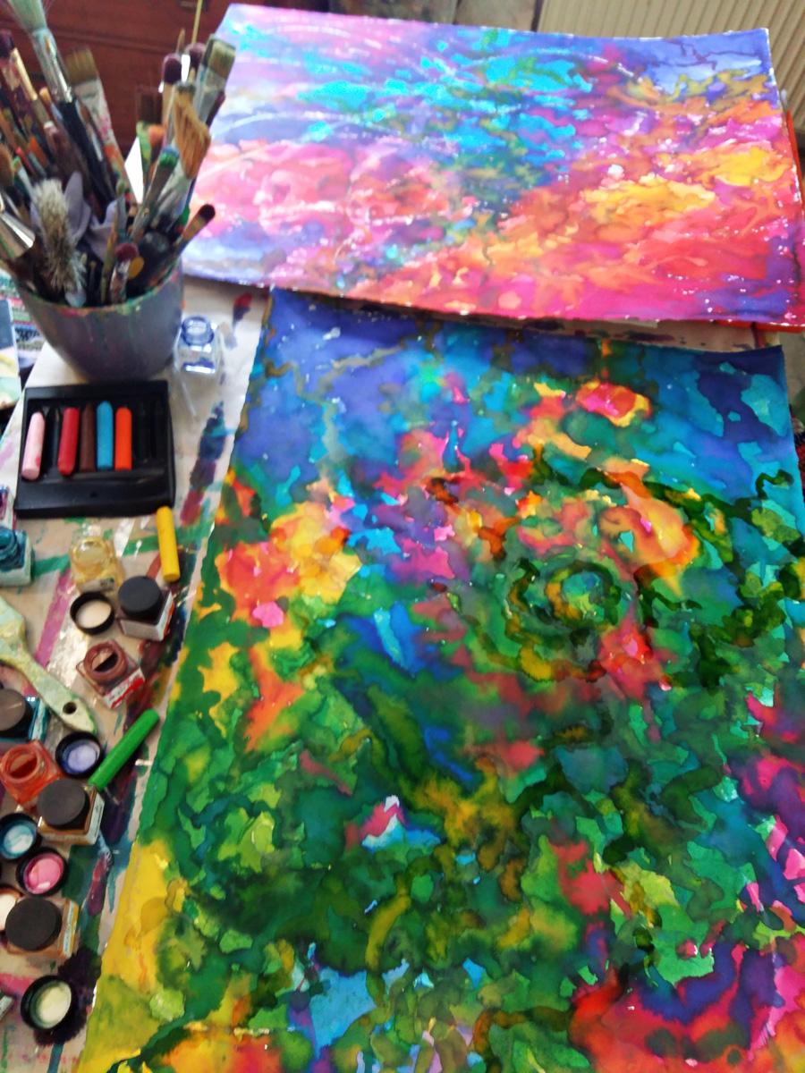 Slikali bomo z akvarelnimi tuši in voščenkami na papir. Vsak bo lahko naredil toliko »prelivanj«, slik, kolikor jih bo lahko. Na začetku bomo naredili krajšo uvodno meditacijo s povezavo s slikami in zvokom, s katero bomo usmerili energijo v željeno smer – vsak zase bo ustvaril namero. Potem bomo prijeli v roke voščenke in tuše in slikali, dokler se vse, kar se ima izraziti, preliti na papir, ne izrazi. Pri tem je pomembno le, da se ves čas zavedamo, kaj ob tem čutimo, kako se počuti naše telo.