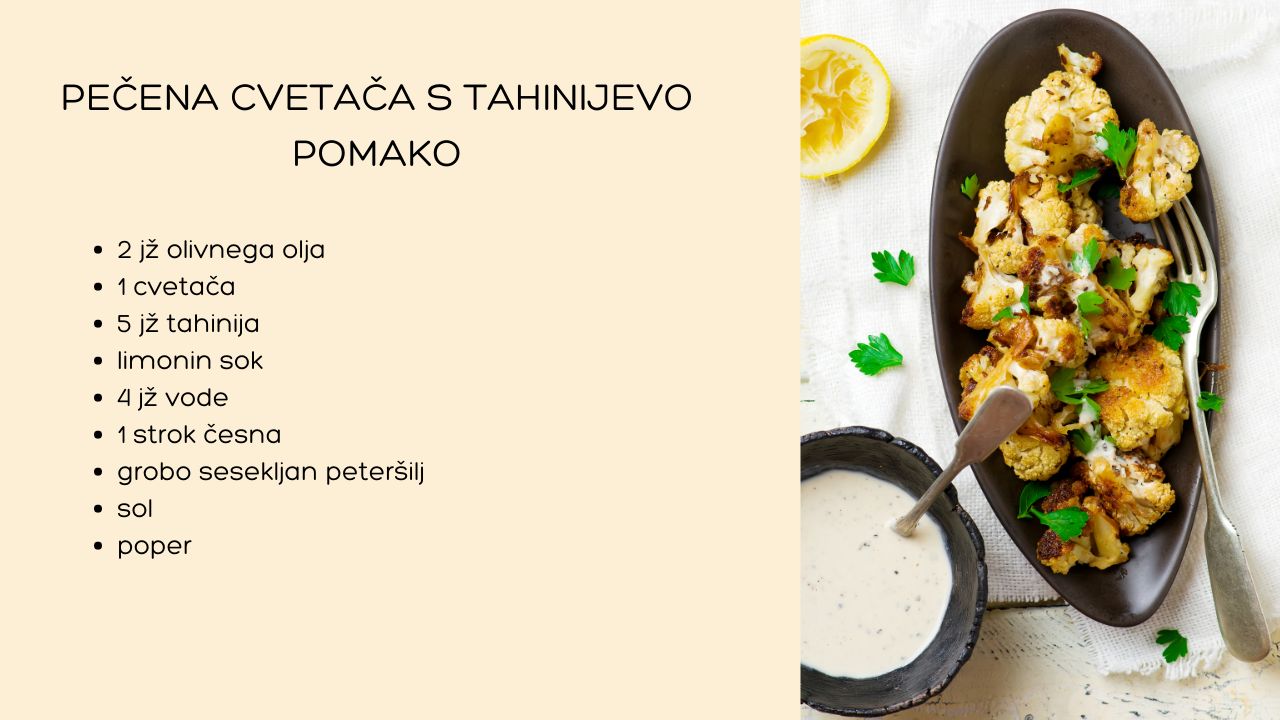Medtem ko se cvetača peče, pripravimo tahini pomako. Česen v možnarju stremo v pasto, ter ga v skodelici skupaj premešamo s tahinijem, limoninim sokom po okusu, vodo, poprom in soljo.