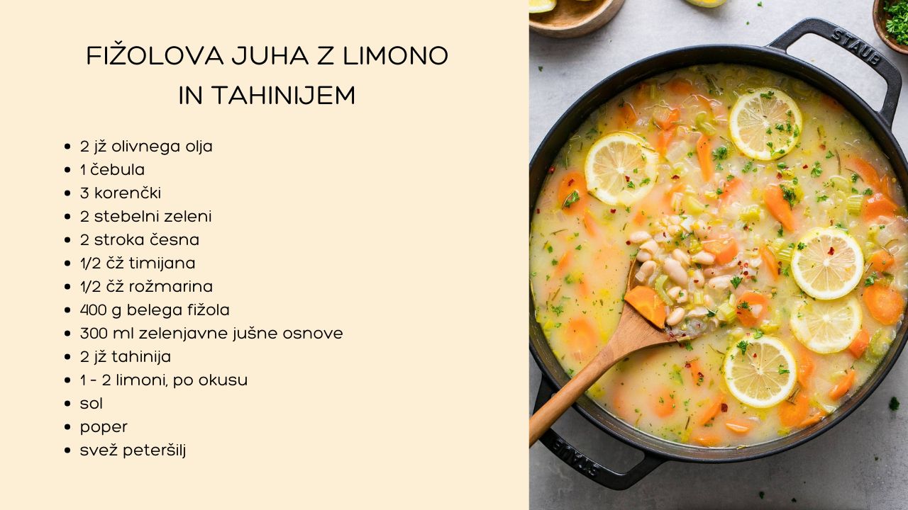 V velikem loncu na olivnem olju prepražimo čebulo. Ko čebula dobi rahlo zlato barvo, ji dodamo še narezano stebelno zeleno in korenček ter skupaj dušimo približno 7 minut. Dodamo še česen, rožmarin in timijan za kakšno minuto, ter lonec zalijemo z zelenjavno jušno osnovo, že kuhanim fižolom, za dodatno aromo pa poskrbimo za tahini, sol in poper. Kuhamo na zmernem ognju 15-20 minut, odstavimo, počakajmo kakšno minuto in dodajmo limonin sok. Na koncu po okusu dodamo peteršilj ali druge začimbe.