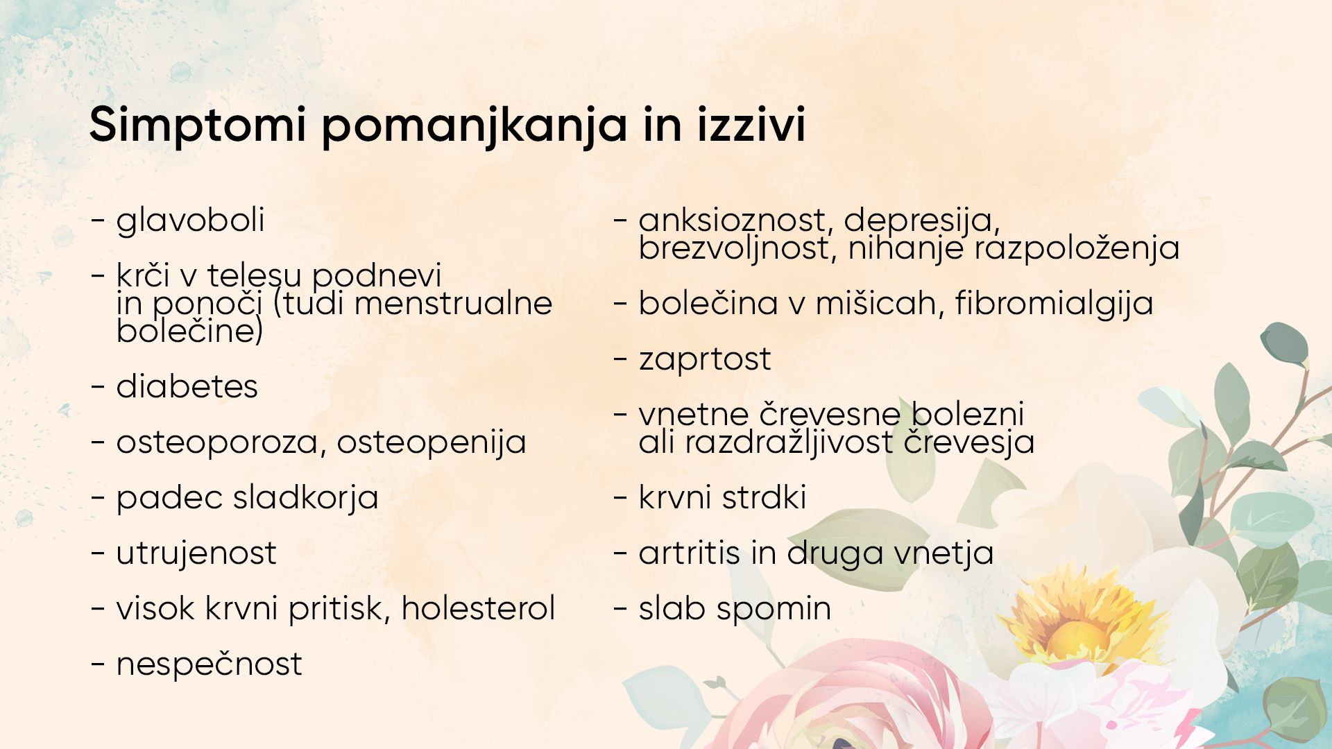 Zaradi sodobnega načina življenja ga večini Slovencev zelo primanjkuje! Govorimo o mineralu magneziju, katerega pomanjkanje (lahko) spremljajo glavoboli, krči v telesu podnevi in ponoči (tudi menstrualne bolečine), diabetes, osteoporoza, osteopenija, padec sladkorja, utrujenost, visok krvni pritisk, holesterol, nespečnost, anksioznost, depresija, brezvoljnost, nihanje razpoloženja, bolečina v mišicah, fibromialgija, zaprtost, vnetne črevesne bolezni ali razdražljivost črevesja, slab spomin in še kaj.