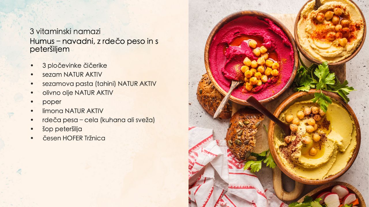 Namesto margarine, marmelade, čokoladnih namazov in raznih predelanih paštet si raje pripravite humus - čičerikin namaz, ki ga lahko popestrite na različne načine - mi smo najprej pripravili navadni humus, v drugi različici smo mu dodali rdečo peso, tretji pa peteršilj. Ni nujno, da namaz namažemo na kruh, ravno obratno - bolj zdravo bo, če si kot prilogo izberete poljubno zelenjavo (narezan korenček, zeleno, papriko ...) in jo kot prigrizek namakate v namaz.