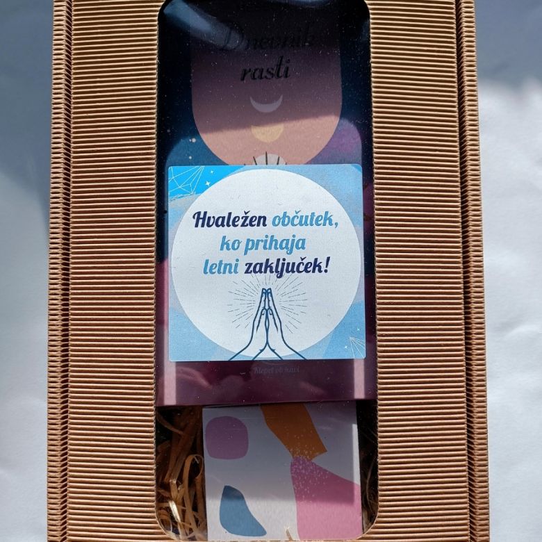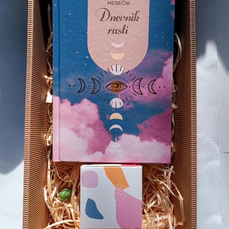 Popolno darilo za zaključek leta, ki spodbuja hvaležnost, notranjo stabilnost in toplino. Vključuje mesečni dnevnik osebne rasti, ki spremlja vaš napredek, kristal žad, simbol varnosti, ter dišečo sojino ritualno svečko, ki vnaša harmonijo in navdih.