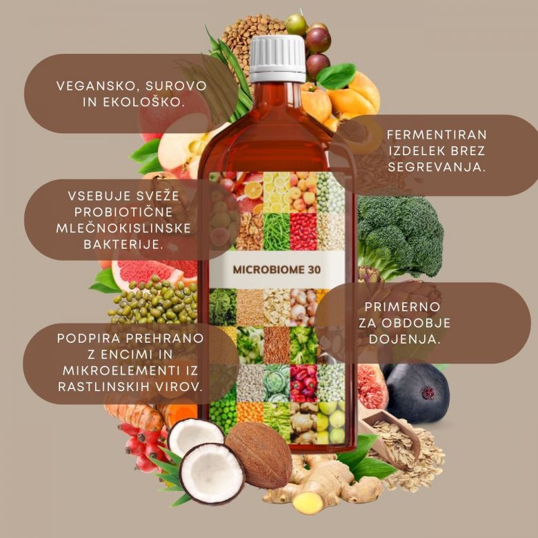 Sestavine (fermentirane): voda, jabolka*, grenivke*, limone*, marelice*, fige*, orehi*, zeleni fižol*, mungo fižol*, šipek*, čebula*, kalčki (grah*, leča*), brokoli*, kodrolistnati ohrovt*, oves*, kokos*, leča*, koromač*, lanena semena*, rdeča paprika*, sončnična semena*, artičoke*, grah*, navadno proso*, zelena*, ingver*, peteršilj*, amarant*, kurkuma*, kamu kamu*.